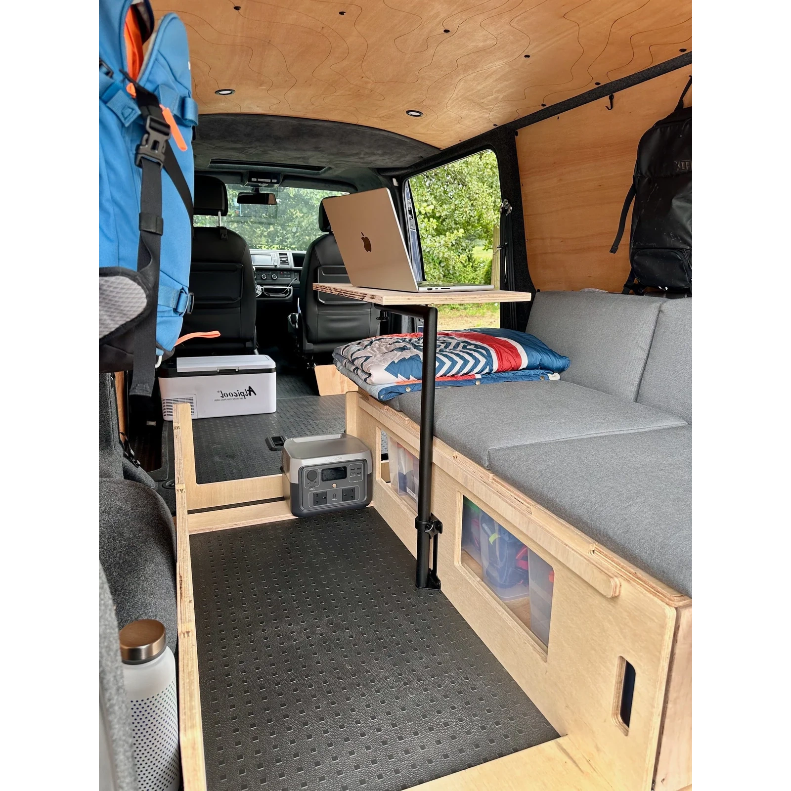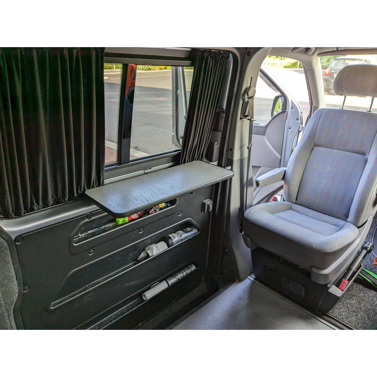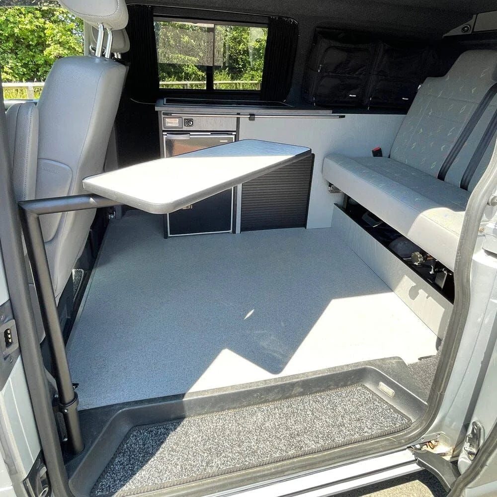 Maximales Tischgewicht: 5 kg (das empfehlen wir, aber das hängt von verschiedenen Faktoren ab - z.B. von den Befestigungen, die Sie verwenden, um das Tischbein an Ihrem Van zu sichern, und von der Stärke der Tischplatte)